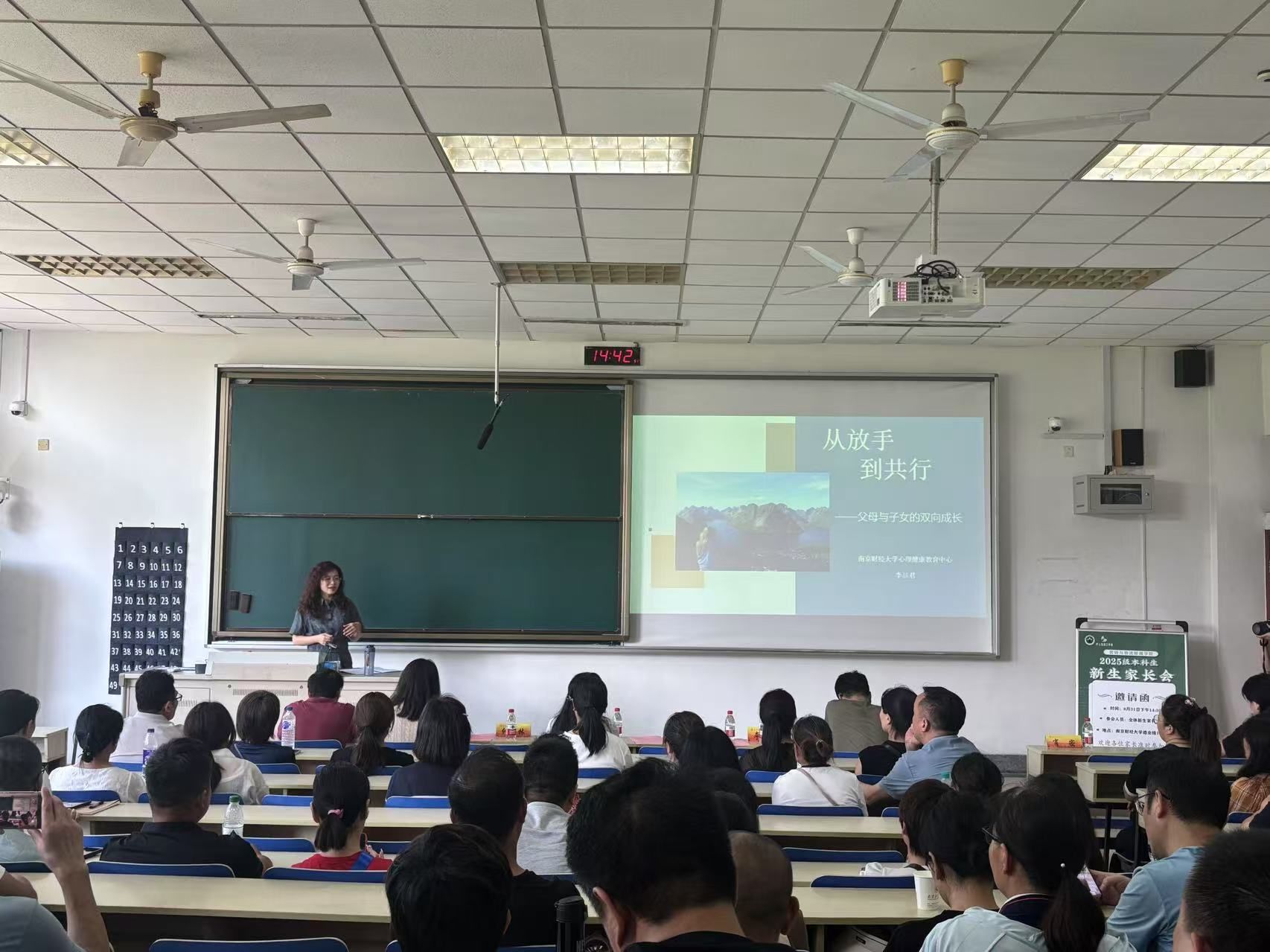 学院特别邀请了校心理健康与教育中心科长李喆君老师,围绕新生心理适应,以“从放手到共行——父母与子女的双向成长”为主题,结合现实案例,为家长提供了实用有效的心理调适方法和沟通技巧,帮助家长更好地支持孩子度过大学适应期。
