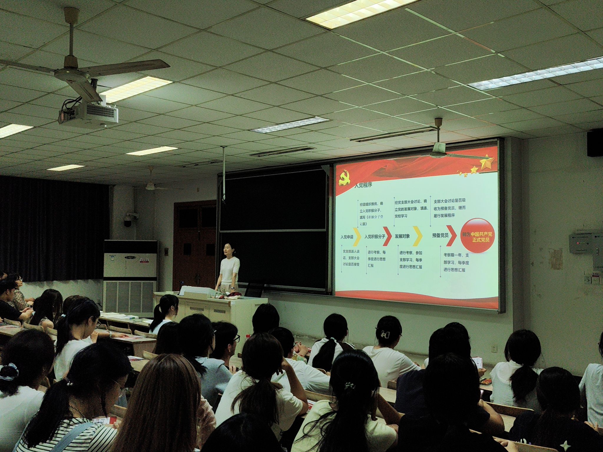 本科生第二党支部书记肖密老师为新生们介绍了发展党员的程序和标准,号召同学们在思想上积极向党组织靠拢,在学习和生活中严格要求自己,发挥先锋模范作用,并鼓励符合条件的同学积极递交入党申请书,学习党的理论知识,用实际行动争取早日加入党组织。